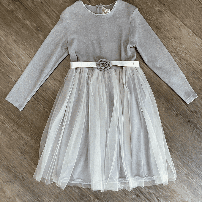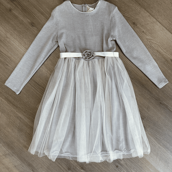 Abito con gonna in tulle e decorazione a rosa in vita.