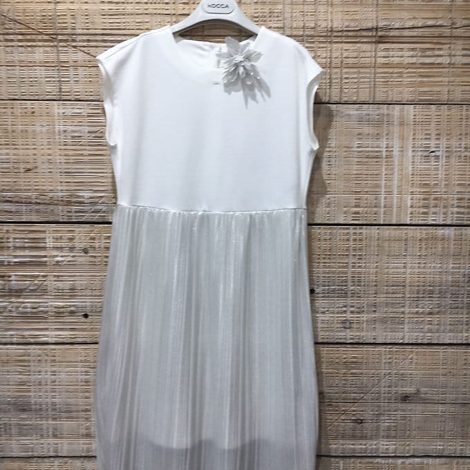 Abito con gonna plissè e spilla fiore.