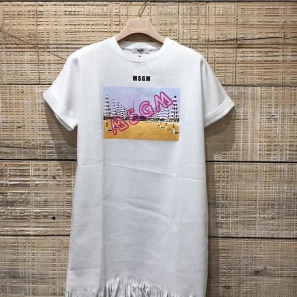 Abito corto a mezza manica con stampa logo sul davanti e orlo a frange.