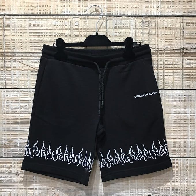Bermuda in felpa con fiamme ricamate sulle gambe.