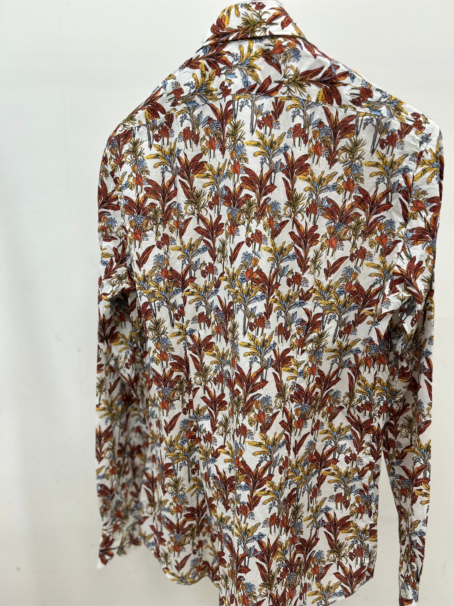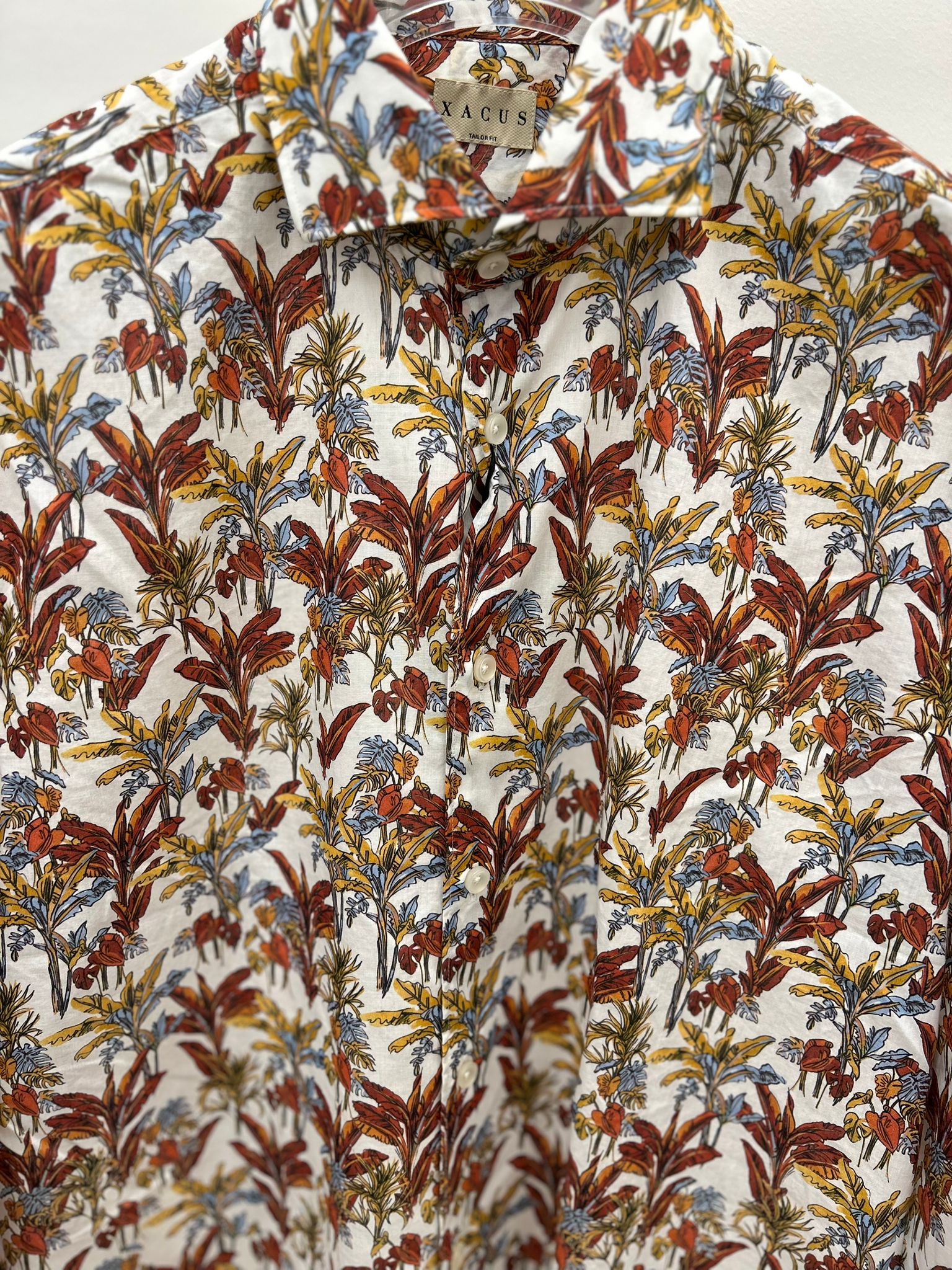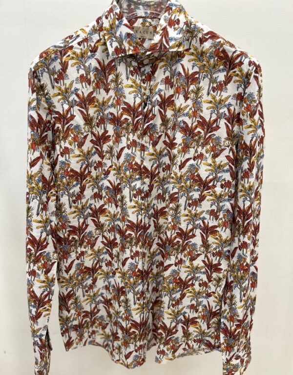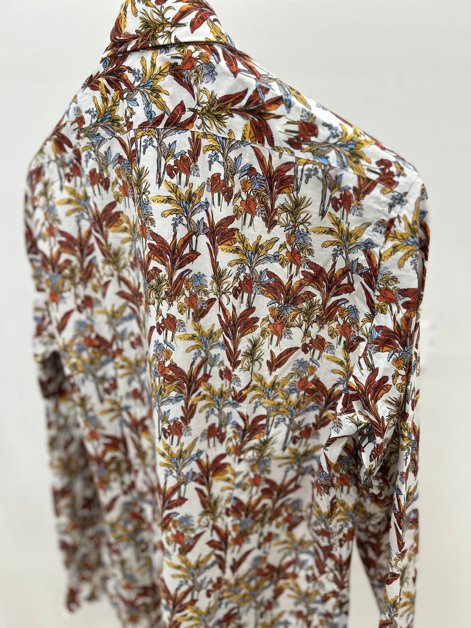 Dettagli foglie stampate color rosso e giallo ocra con punta di azzurro