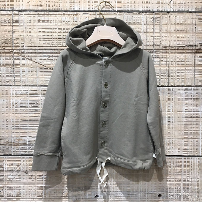 Felpa con cappuccio e chiusura a bottoni, nastrino sul fondo.
