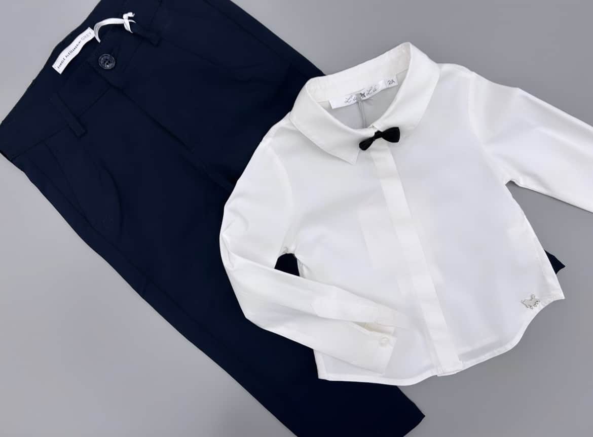 Per un look elelgante abbinare con camicia bianca con papillon applicato e pantalone ALESSANDRINI