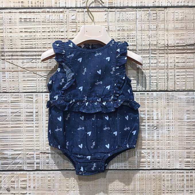 Pagliaccetto in denim con volant sulle maniche e stampa mini loghi.