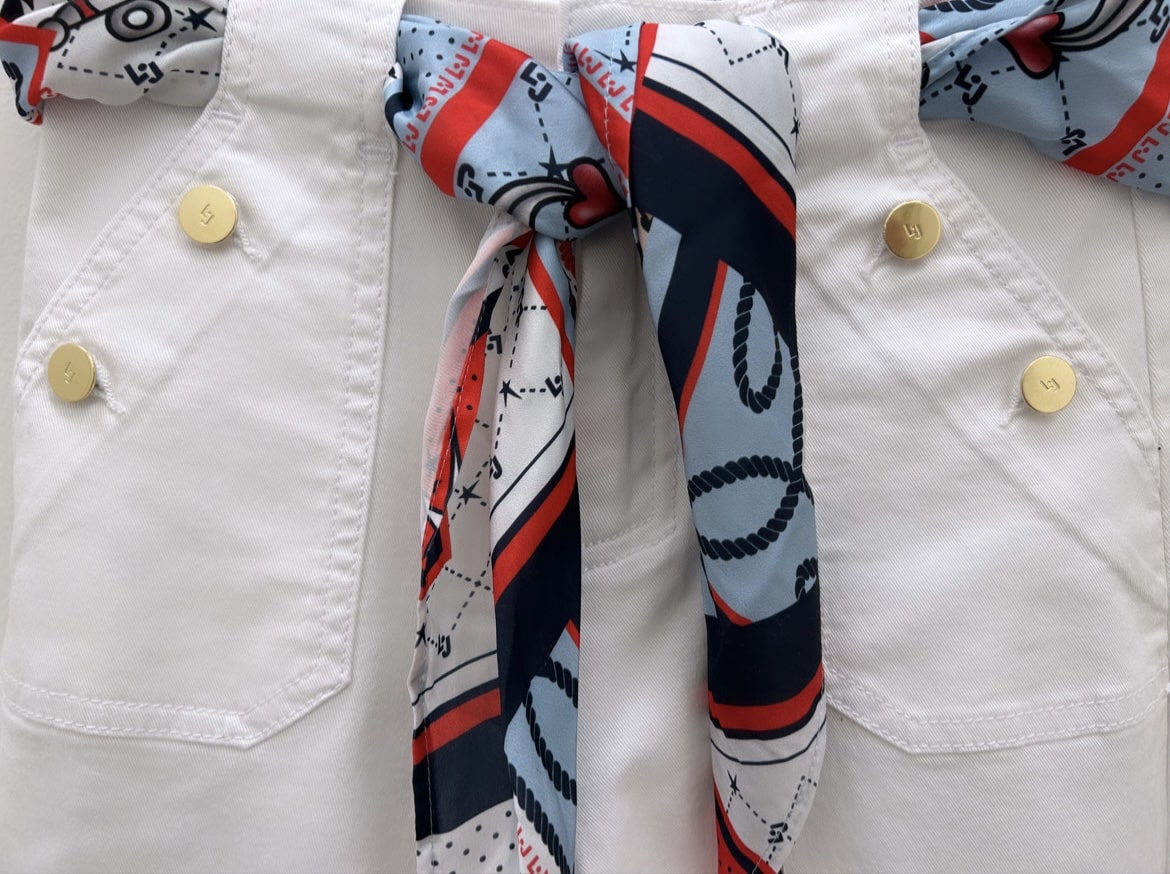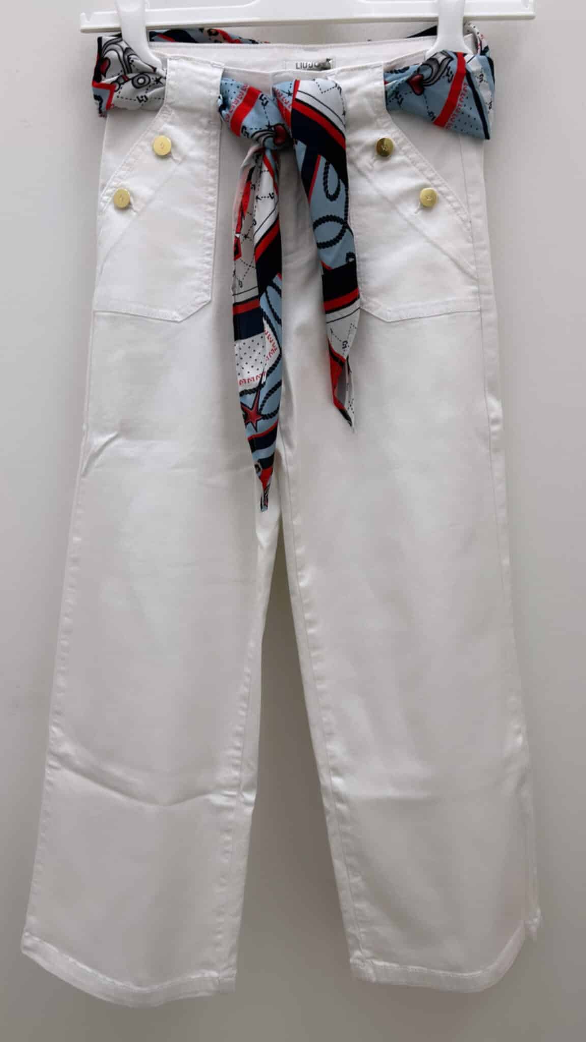 Pantalone largo vita alta con tasche sterne impreziosite da bottoni oro personalizati e foulard