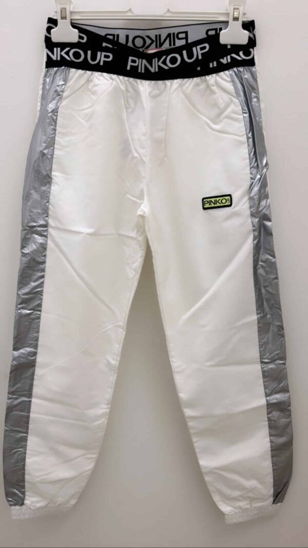 Pantalone in nylon  vestibilità regular con bande laterali color argento elastico arricciato sulle caviglie e logato in vita