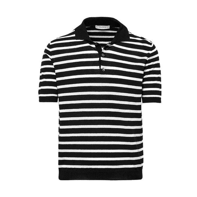 Polo a maniche corte motivo riga marina a due colori bianco e nero. Chiusura con bottoni madreperla. Collo fondo maglia e manica in costa fine.