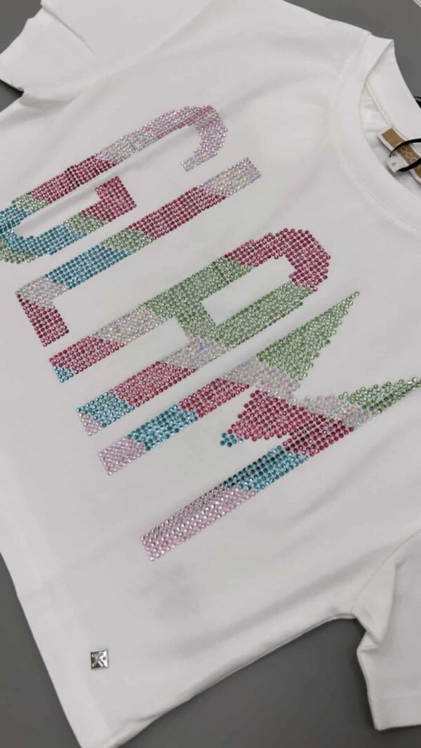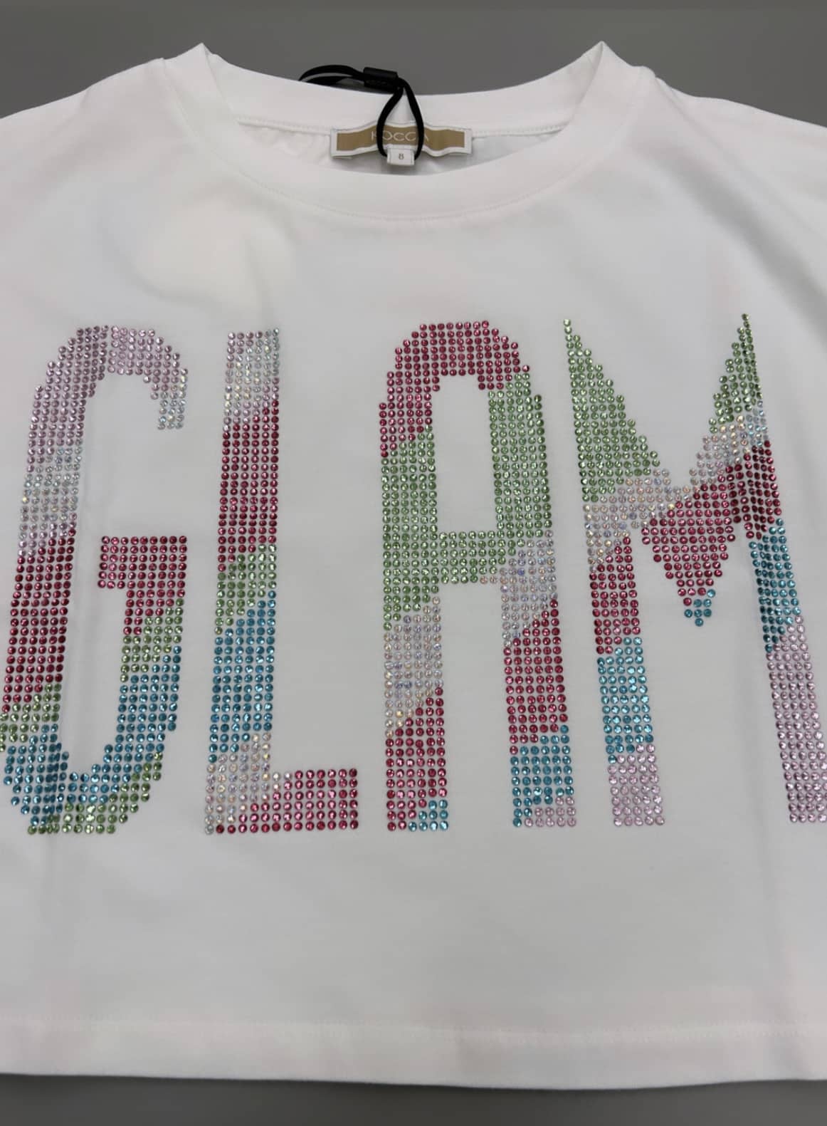 T-shirt mezza manica con scritta GLAM in stras multicolor