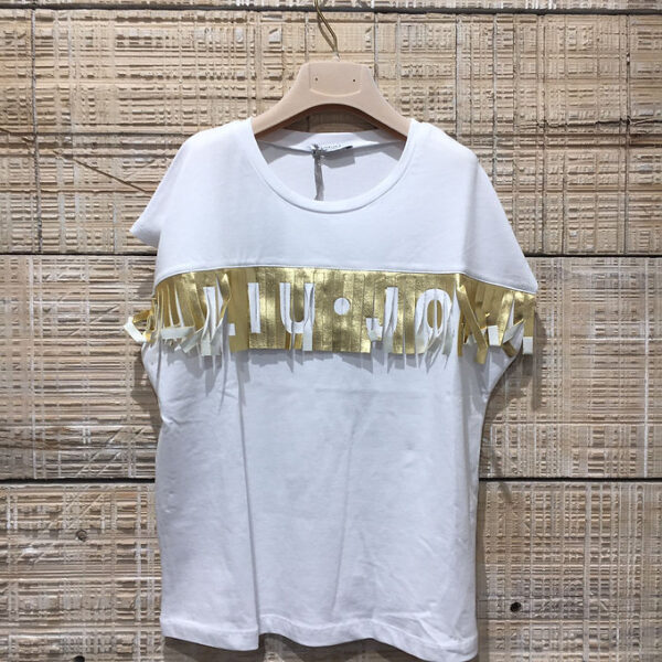 T-shirt a girocollo con applicazione di frange dorate sul davanti.