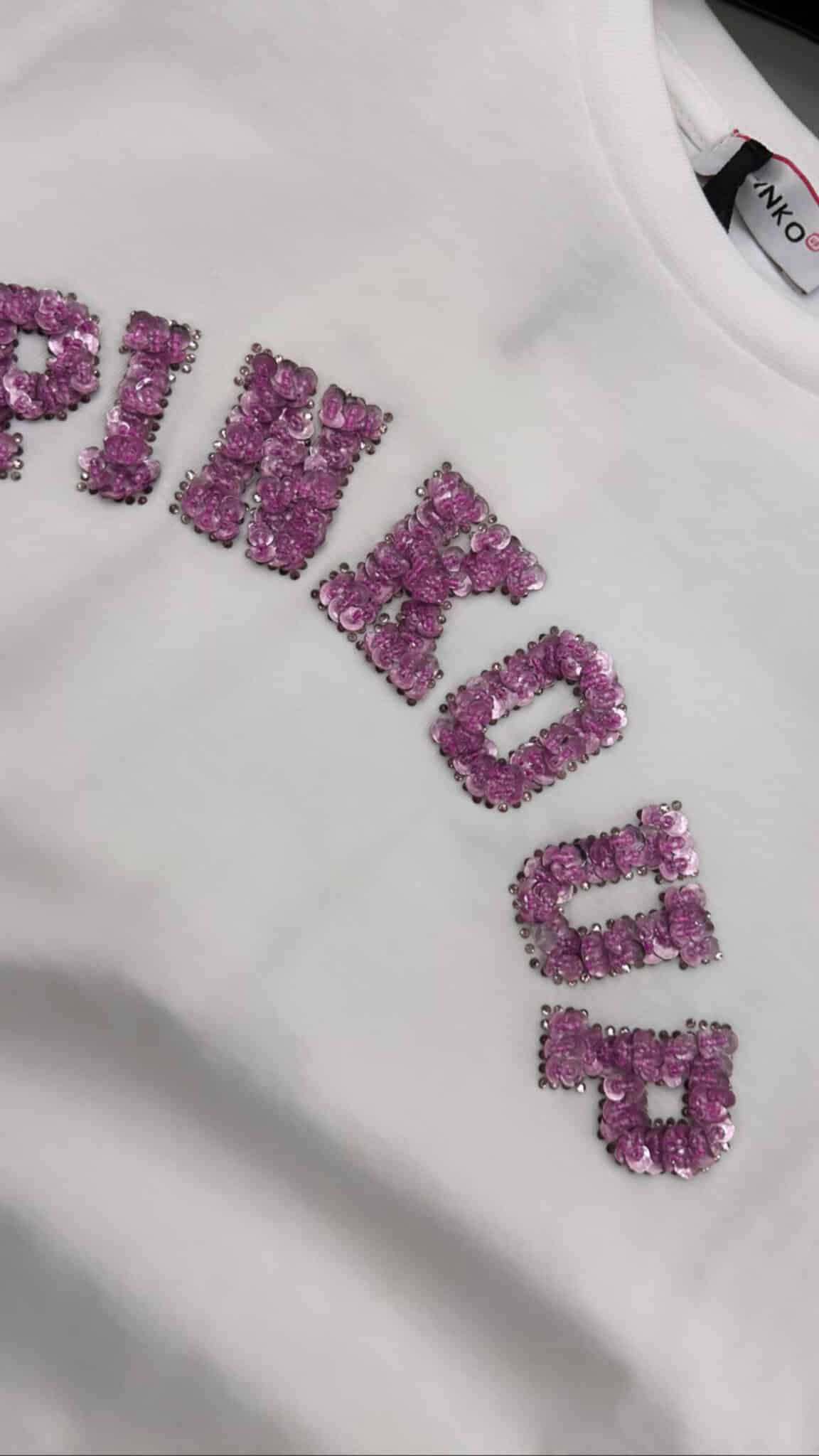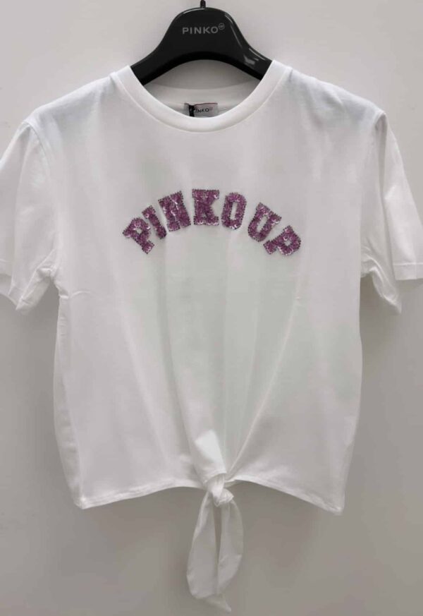 T-shirt mezza manica annodata davanti con logo in pailettes color  lilla
